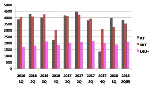 SK텔레콤은 2016년 만해도 KT를 근소하게 앞섰지만, 작년부터 KT와 엎치락 뒤치락 하더니 올 1분기에 이어 2분기까지 KT가 앞설 것으로 보인다.
