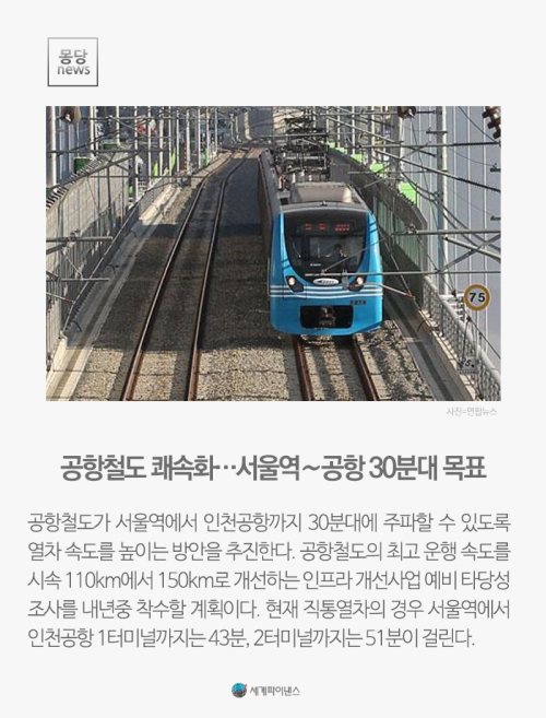 공항철도가 서울역에서 인천공항까지 30분대에 주파할 수 있도록 열차 속도를 높이는 방안을 추진한다. 공항철도의 최고 운행 속도를 시속 110km에서 150km로 개선하는 인프라 개선사업 예비 타당성 조사를 내년중 착수할 계획이다. 현재 직통열차의 경우 서울역에서 인천공항 1터미널까지는 43분, 2터미널까지는 51분이 걸린다.