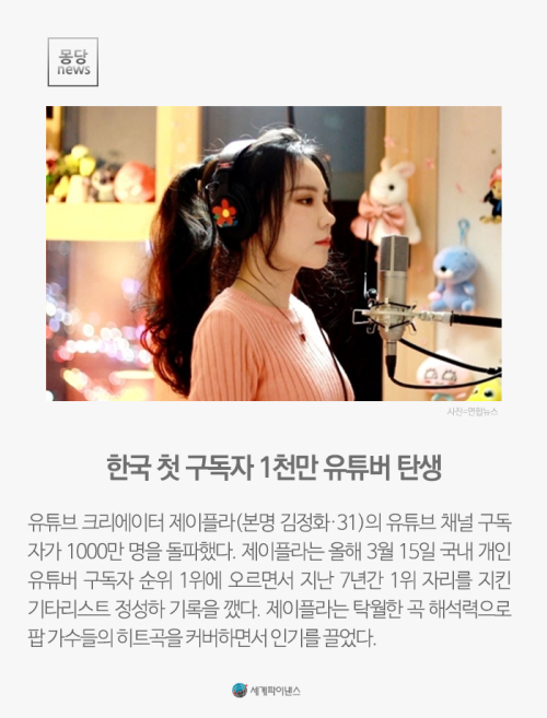 유튜브 크리에이터 제이플라(본명 김정화·31)의 유튜브 채널 구독자가 1000만 명을 돌파했다. 제이플라는 올해 3월 15일 국내 개인 유튜버 구독자 순위 1위에 오르면서 지난 7년간 1위 자리를 지킨 기타리스트 정성하 기록을 깼다. 제이플라는 탁월한 곡 해석력으로 팝 가수들의 히트곡을 커버하면서 인기를 끌었다.