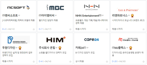그 밖의 ㈜케이씨씨(인테리어전문직 채용, 채용시까지), ㈜카카오게임즈(Project FI 3D 배경모델러 채용, 4월 27일까지), ㈜해커스어학원(㈜해커스어학원, 채용시까지), 에프알엘코리아(IMD팀 VMD 담당자, 4월 11일까지), 한국골프산업연구원(웹디자이너 채용, 채용시까지) 등에서 인재를 모집하고 있다.