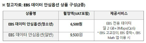 지난 3월 과학기술정보통신부와 함께 출시한 'EBS 데이터 안심옵션(청소년)'은 스마트폰에서 EBS 애플리케이션 3종(EBSi 고교강의, EBS 중학+, EBS Math)을 시청할 경우 하루에 2GB의 데이터를 제공하는 부가서비스다.