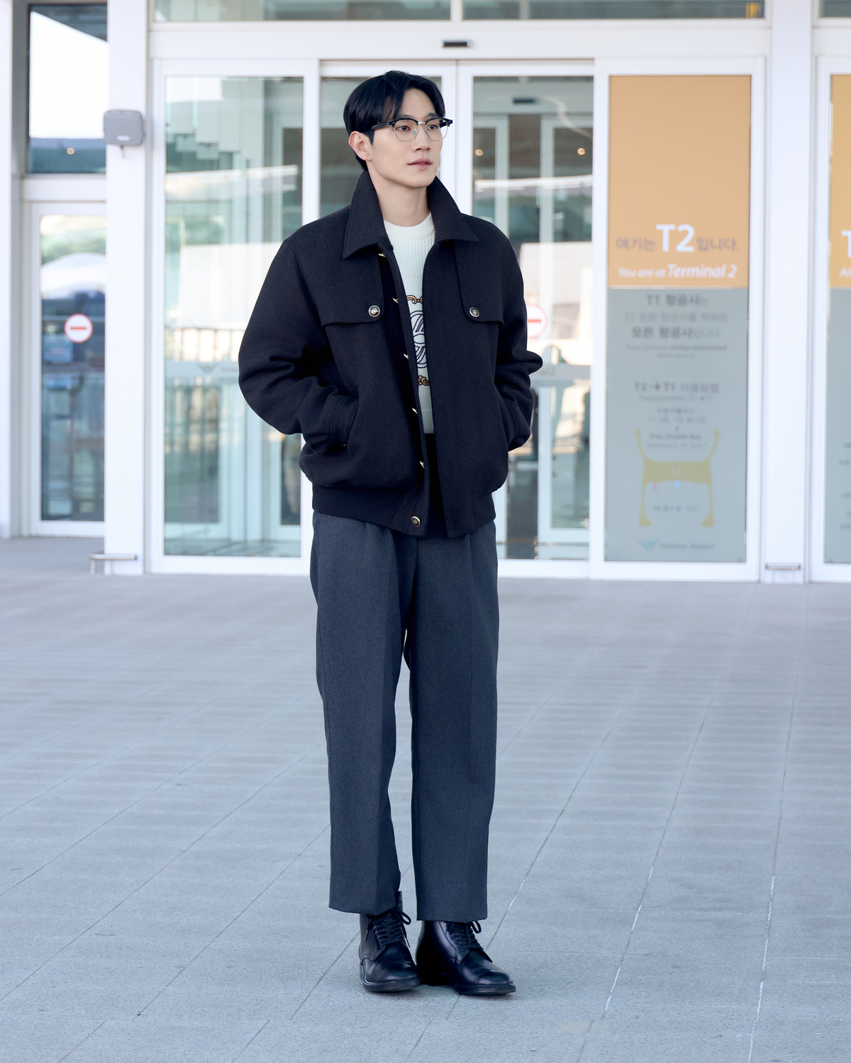 이날 노상현은 브랜드 로고와 그룸 자수 디테일이 들어간 골지 마감의 라운드 칼라 스웨터에 그레이 컬러의 크롭 팬츠와 재킷을 더해 훈훈한 남친룩의 정석 같은 공항패션을 선보였다.