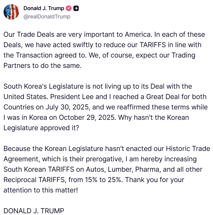 트럼프 대통령은 27일 소셜미디어 트루스소셜에 “한국 국회가 미국과의 협정을 이행하지 않고 있다. 이재명 대통령과 나는 지난해 7월 양국 모두에 훌륭한 대단한 협정을 체결했고 같은해 10월 내가 한국에 있을 때도 이 조건들을 재확인했는데, 한국 국회는 이를 승인하지 않고 있다”고 밝혔다. 그는 이어 "한국산 자동차, 목재, 의약품 및 모든 기타 상호 관세에 대한 한국 관세를 15%에서 25%로 인상한다"고 강조했다. 앞서 미국은 한국의 3500억달러 규모의 대미 투자를 조건으로 관세를 낮추기로 한 바 있다.