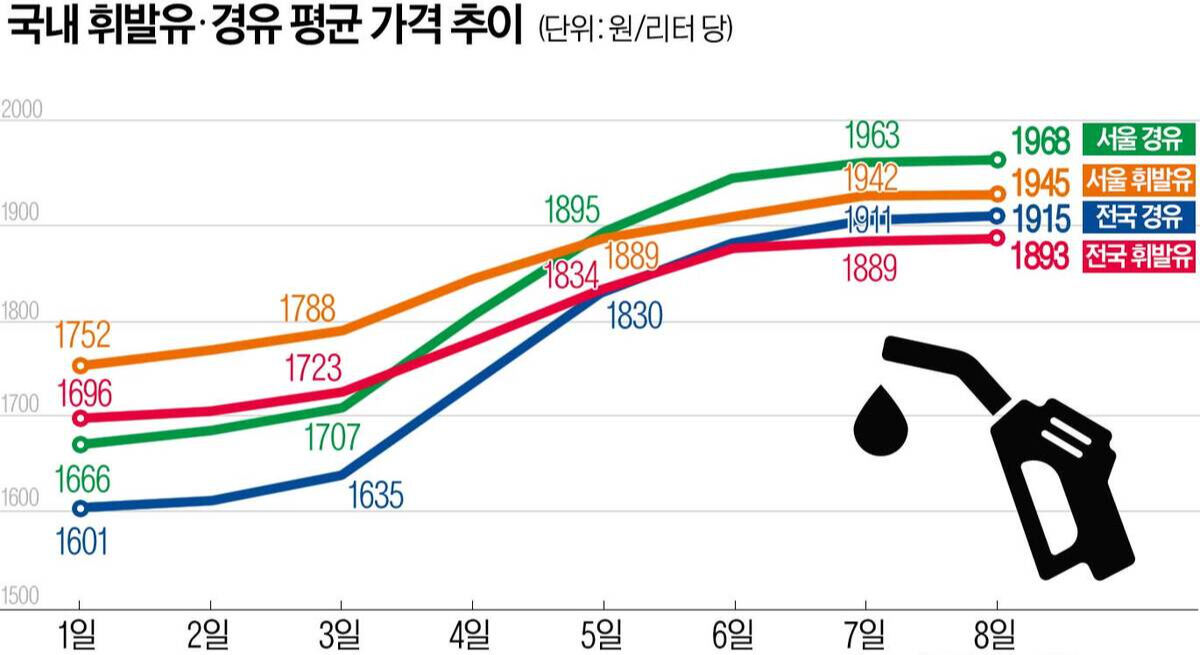 그럼에도 국내 주유소의 기름값은 꺾이지 않고 있다. 한국석유공사 유가정보시스템 오피넷에 따르면 지난 7일 밤 11시 기준 전국 주유소 평균 휘발유 가격은 ℓ당 1890.87원이며, 서울의 경우 평균가는 1942.08원이다. 결국 이날 서울의 한 주유소의 기름값은 보통휘발류 2049원, 경유 2139원, 고급휘발유 2269원을 찍었다.